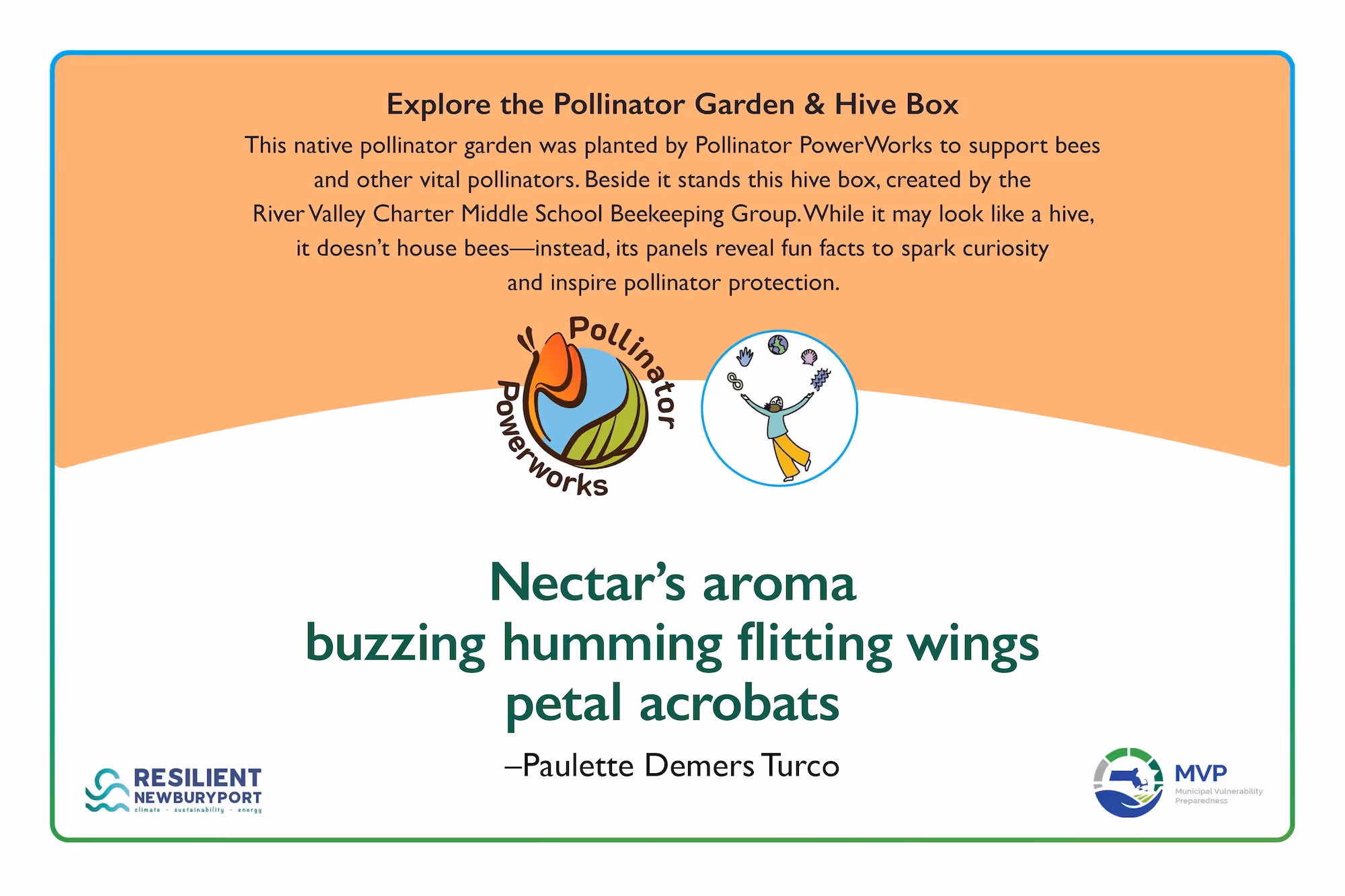 Soon, in partnership with the River Valley Charter School Beekeeping Group, we will install their handcrafted hive box beside the sign — a unique, student-built project that looks like a real beehive but houses no bees. Instead, its panels open to reveal fun facts and insights about pollinators, inviting visitors to explore, learn, and connect with nature. Together, the garden, haiku sign, and hive box create a living space for art, education, and environmental stewardship.